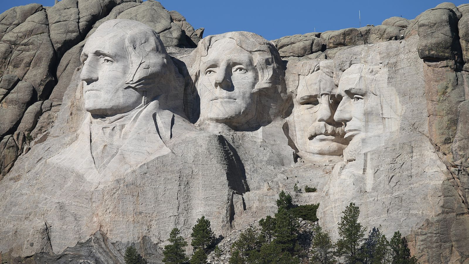 A bird’s eye view of Mt. Rushmore from a helicopter.